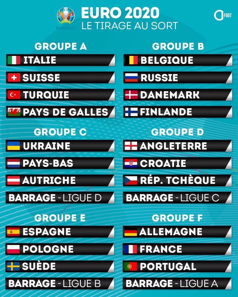 Le tirage de la phase de groupes de l’Euro 2020, qui se déroulera dans douze pays d’Europe du 12 juin au 12 juillet prochain, a bien eu lieu au début de cette soirée et a rendu son verdict à Bucarest en Roumanie. A rappeler que le coup d’envoi sera à Rome avec un Turquie-Italie, au stadio Olimpico. La France finaliste lors de la précédente édition organisée chez elle en 2016, est placée dans le groupe F avec l’Allemagne, le Portugal et une équipe issue des barrages de la Ligue des nations, qui d’ores et déjà appelé le « groupe de la mort »
