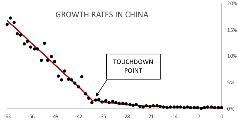 Là encore, le modèle additif part du principe que des contre-mesures strictes – éloignement, isolement, port de masque et tests – peuvent avoir un impact radical sur la propagation du Covid 19, en réduisant assez rapidement sa croissance à un niveau proche de zéro, suivi d’une période de croissance résiduelle gérable qui permet aux systèmes de santé et aux économies de se redresser.