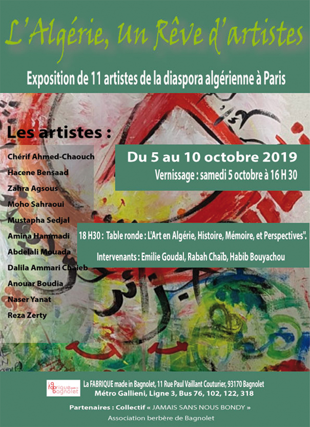 Accueil>Politique>Exposition de 11 artistes de la diaspora algérienne à Paris du 5 au 10 octobre 2019 A la uneCulture Exposition de 11 artistes de la diaspora algérienne à Paris du 5 au 10 octobre 2019 Farid Chouia30 septembre 2019 39 Moins d’une minute Facebook X Linkedin Pinterest Messenger Messenger WhatsApp Telegram Partager par email Imprimer Farid Chouia30 septembre 2019 39 Moins d’une minute Facebook X Linkedin Pinterest Messenger Messenger WhatsApp Telegram Partager par email Imprimer Partager Facebook X Linkedin Messenger Messenger WhatsApp Partager par email Imprimer
