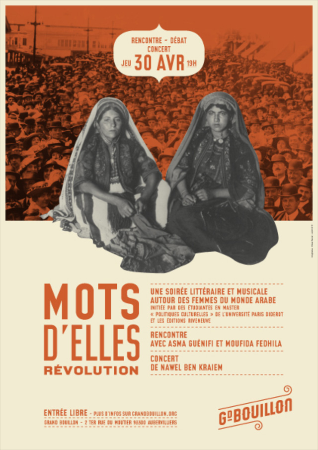 Nous avons le plaisir de vous inviter au volet « Révolution! » de notre festival Mots d’Elles le jeudi 30 avril à partir de 19h, au Grand Bouillon à Aubervilliers (2 ter rue du Moutier), organisé en partenariat avec les éditions Riveneuve.