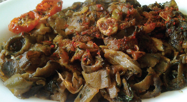 Dans une poêle, faites chauffer un filet d’huile d’olive, y faire revenir les oignons. Ajoutez les fèves, le sel et les épices. Couvrez et laissez cuire à feu doux (vous pouvez ajouter 1/2 verre d’eau si nécessaire).