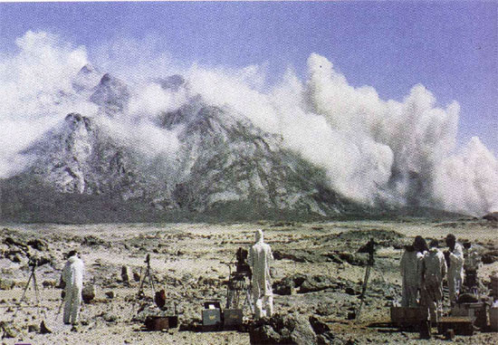 Tous les éléments de la bombe se gazéifient et la pression énorme de ce gaz crée une onde de choc qui produit une destruction mécanique. A cet effet s’ajoutent l’onde lumineuse qui brûle et un rayonnement radioactif. Sur place, un commentateur dont le reportage sera diffusé plus tard à la radio décrit la lente montée du champignon dont le sommet est blanchâtre et le bas mauve. Il s’élève en même temps qu’il se développe, son sommet s’élargissant sans cesse. Les compagnies aériennes savent depuis le 8 janvier 1960 qu’une superficie d’environ trois fois la France sera interdite au survol le jour de l’explosion.