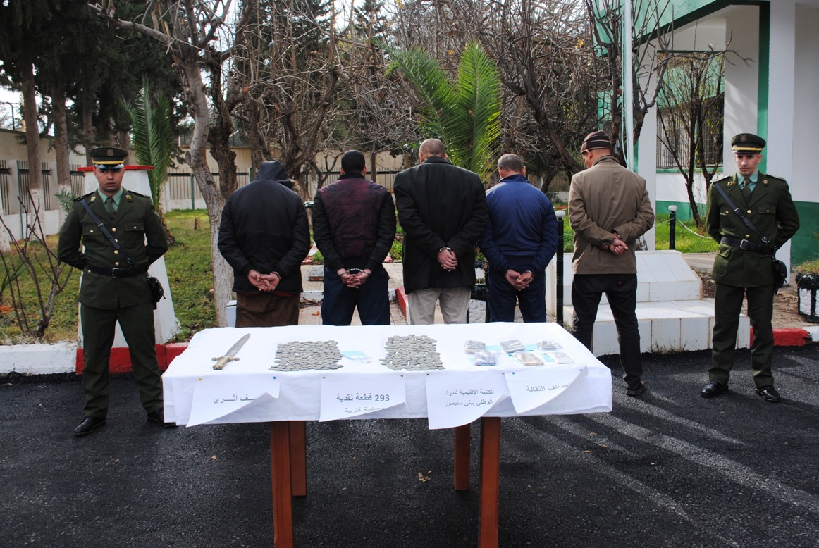 Dans un autre contexte et dans le cadre de la protection et la préservation du patrimoine matériel historique, des éléments de la Gendarmerie Nationale ont démantelé à Béni Slimane, wilaya de Médéa/1èreRM, un réseau criminel de trafic de différents articles archéologiques notamment sur l’espace cybernétique. Cette opération a permis d’arrêter (05) individus et de saisir une (01) épée historique et (293) pièces de monnaie archéologiques datant de l’époque romaine et de celle de la présence espagnole en Algérie.