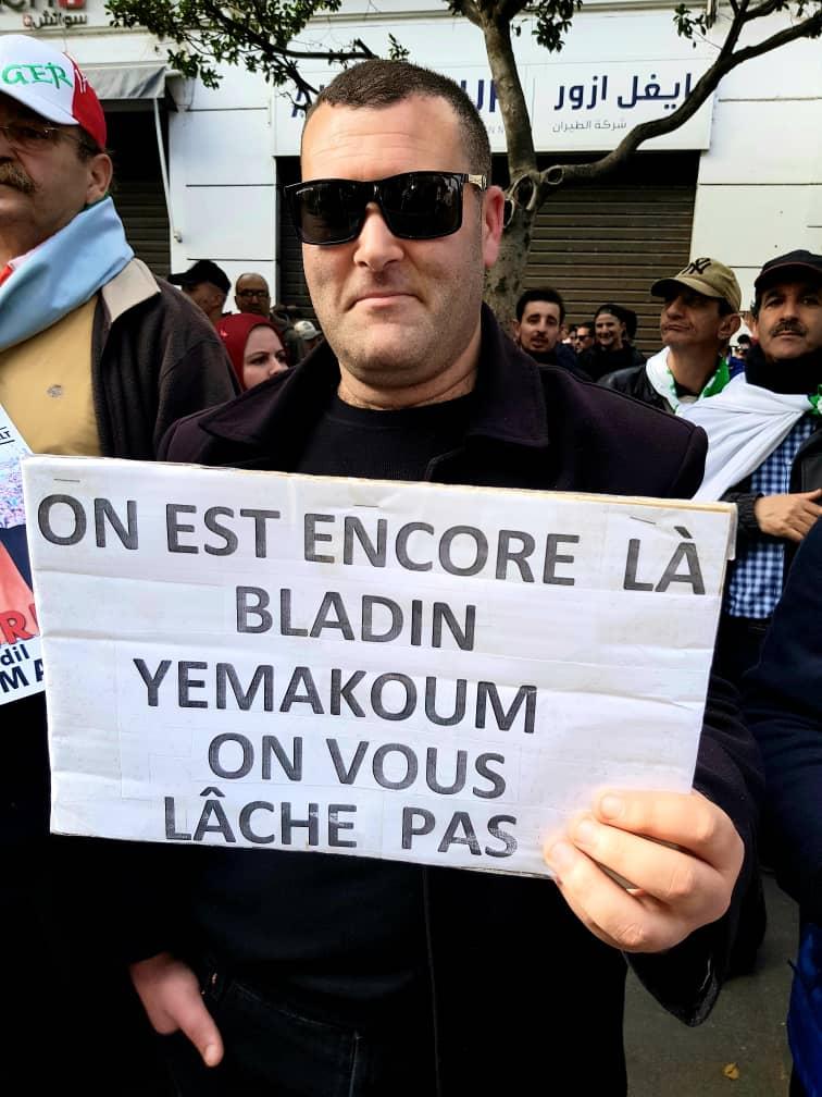 « Maintenir la pression est plus que jamais à l’ordre du jour. Ils vont finir par céder », lancera un manifestant drapé de l’emblème national. Réglé comme une machine hautement sophistiquée et merveilleusement bien huilée, le Hirak a, bien évidement, repris ses thèmes et ses slogans habituels : « Koulna el issaba t’rouh » (nous avons dit que le clan cédera le pouvoir) ; « Ya Ali, ouladek mahoum’che habsine, ala el hourrya mâawline » (Ali (Ali la Pointe, ndlr), tes enfants ne vont pas s’arrêter, la liberté est leur ultime but) ; « dawla madania, machi askaria » (un État civil, non militaire)…