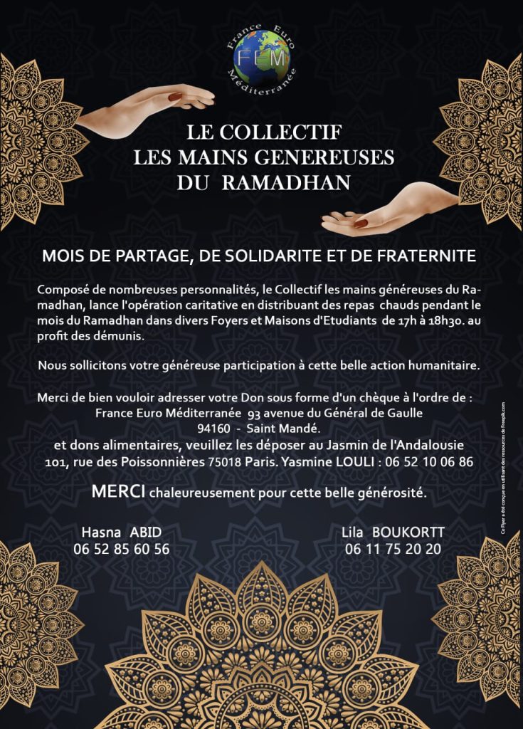 Quant au Collectif Les mains généreuses du Ramadan, dont les membres sont issus de l’Association France Euro-Méditerranée, est naît tout aussi spontanément en avril 2021, pour apporter soutien et assistance aux personnes âgées, aux femmes isolées et travailleurs étrangers.