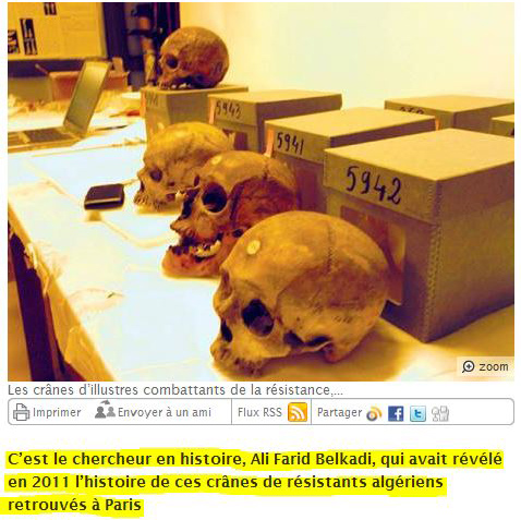 La violence de la conquête militaire de l’Algérie par la France, s’est doublée de prétentions scientifiques niant à des êtres humains le droit d’être enterrés dignement. Ainsi, dans les années 1830-1850, des médecins souvent en lien avec la Société d’anthropologie de Paris, notamment des chirurgiens de l’Armée d’Afrique, ont collectionné des crânes de résistants à la colonisation, tués au combat ou assassinés de manière ignoble, menant diverses études plus ou moins sérieuses à leur sujet.