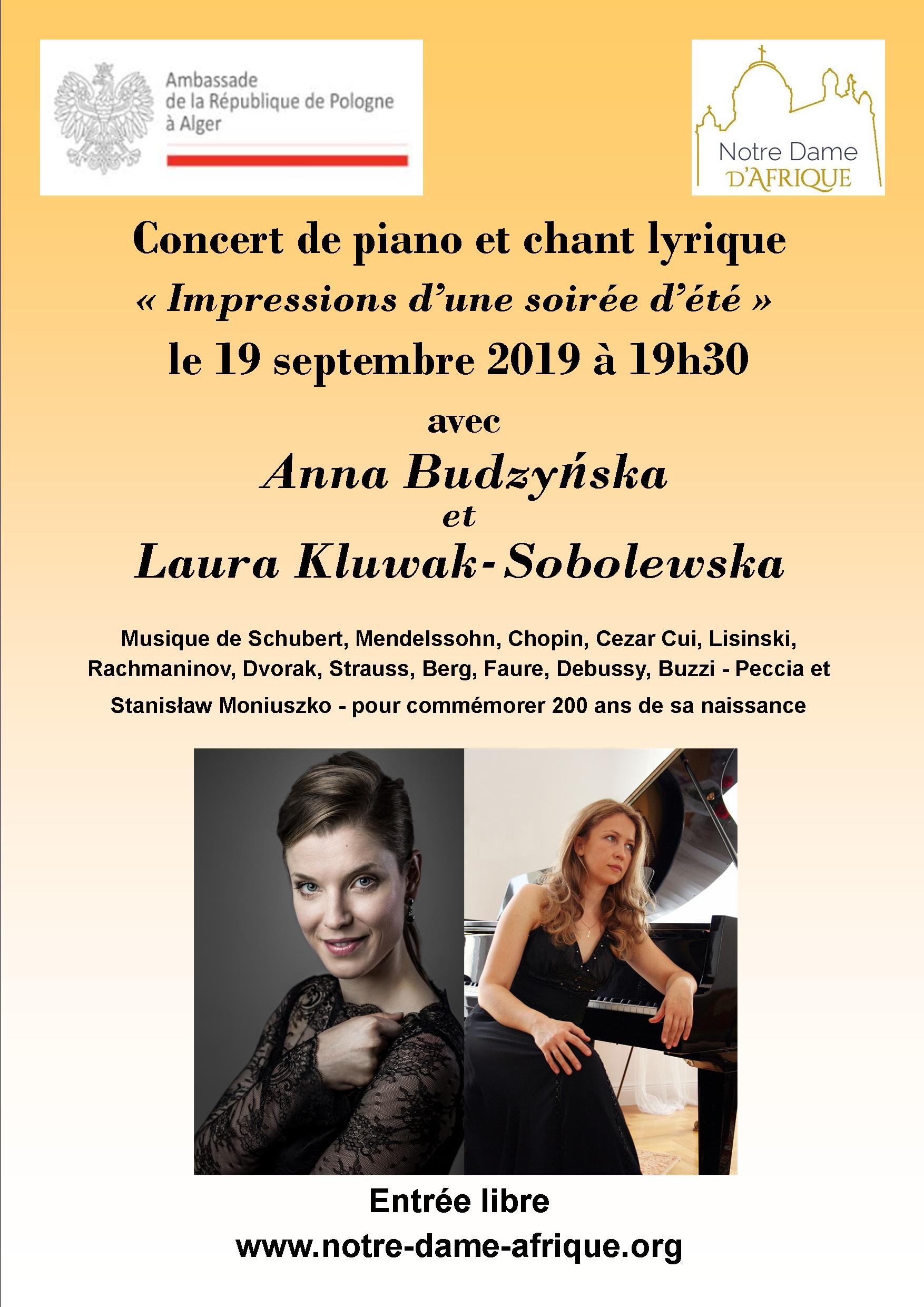 A l’occasion du bicentenaire de la naissance de Stanisław Moniuszko, la Basilique Notre-Dame d’Afrique et l’Ambassade de Pologne vous invitent au concert de piano et de chant lyrique: « Les Impressions d’une soirée d’été » avec Ania Budzyńska et Laura Kluwak – Sobolewska.
