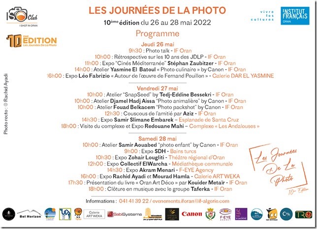 Les Journées de la Photographie d’Oran auront lieu cette année les 26, 27 et 28 mai 2022. Ce sera la 10ème édition de cet évènement incontournable.