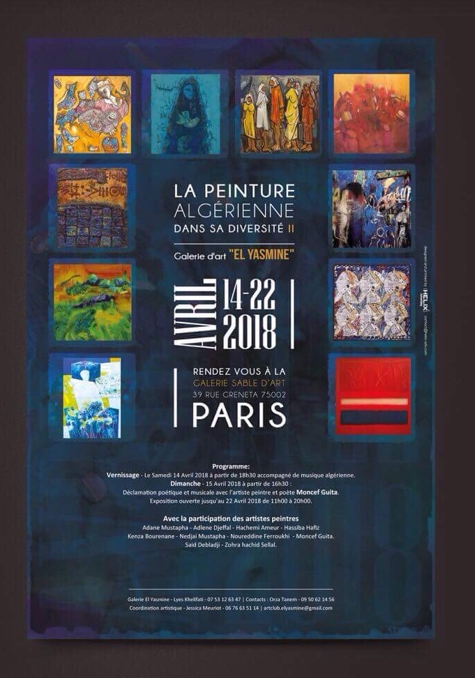 Cette exposition a permis de faire voyager l’art contemporain algérien et de révéler un aperçu de la diversité de sa peinture hors de ses frontières. Cette manifestation a offert une large palette d’œuvres (150), abordant différents sujets, styles, techniques et esthétismes ; elle a réuni dix artistes peintres et plasticiens algériens confirmés Adnane Mustapha, Adlène Djeffal, Hachemi Ameur, Nedjaï Mustapha, Noureddine Ferroukhi, Saïd Debladji et quatre autres que nous avons eu la chance de rencontrer, dont Zohra Hachid Sellal, qu’on ne présente plus, qui passe cette fois-ci par une période plus poétique et a qui « besoin d’un moment d’évasion » : pour ce faire, elle s’est inspirée des comptes algériens et nomme la série qu’elle a présenté « amachahou » ; ses œuvres sont empreintes d’émotion, de douceur et d’humour.