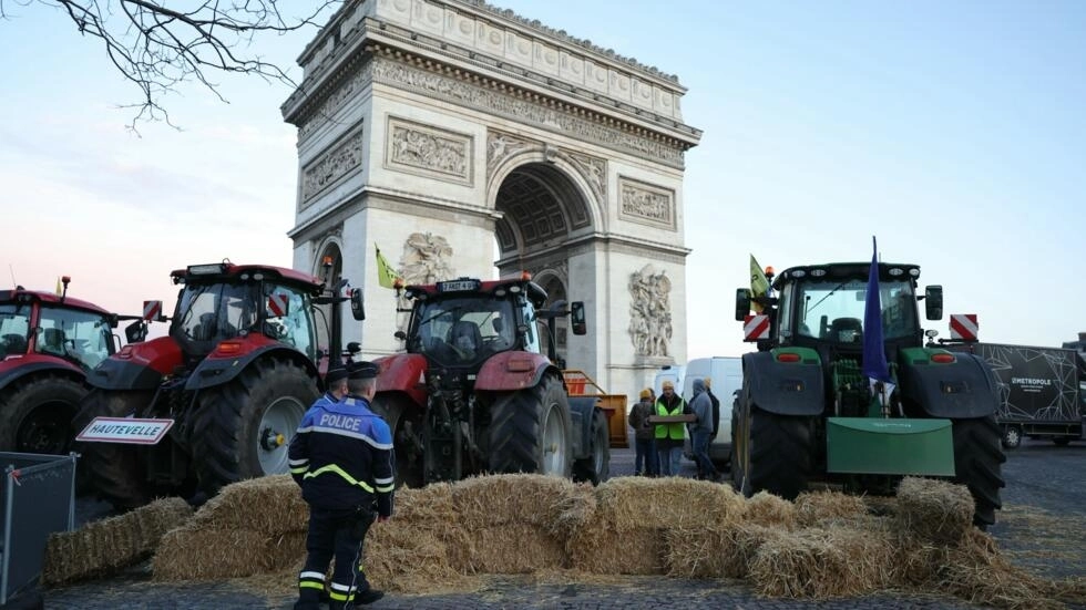 Des bottes de foin sont deversées devant l’Arc de Triomphe vendredi 1er mars 2024 dans une opération coup de poing menée par la Coordination rurale.