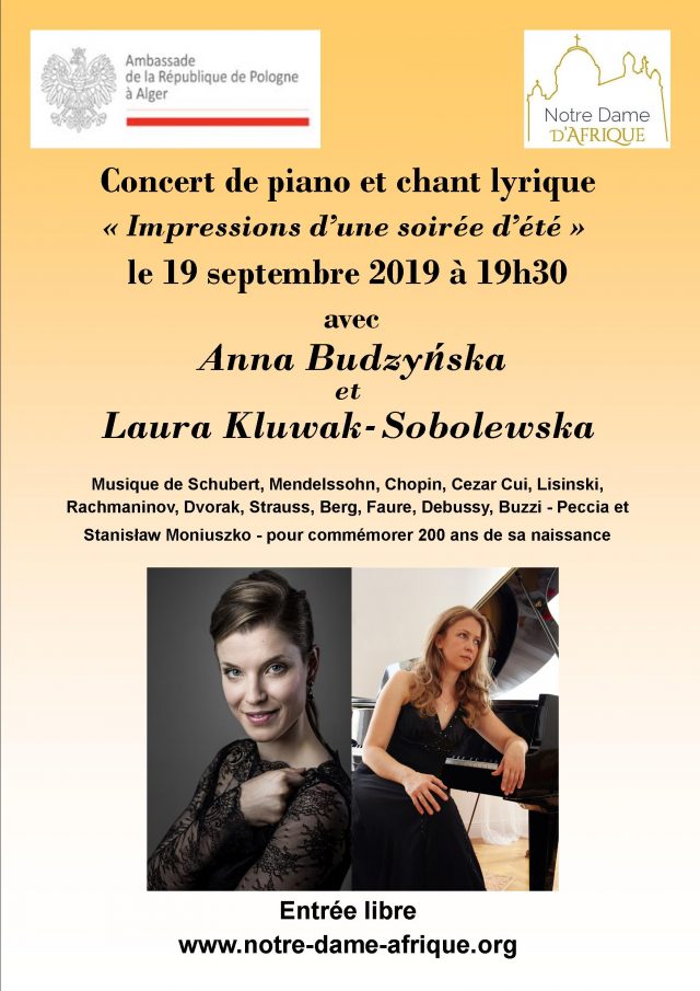 A l’occasion du bicentenaire de la naissance de Stanisław Moniuszko, la Basilique Notre-Dame d’Afrique et l’Ambassade de Pologne vous invitent au concert de piano et de chant lyrique: « Les Impressions d’une soirée d’été » avec Ania Budzyńska et Laura Kluwak – Sobolewska.