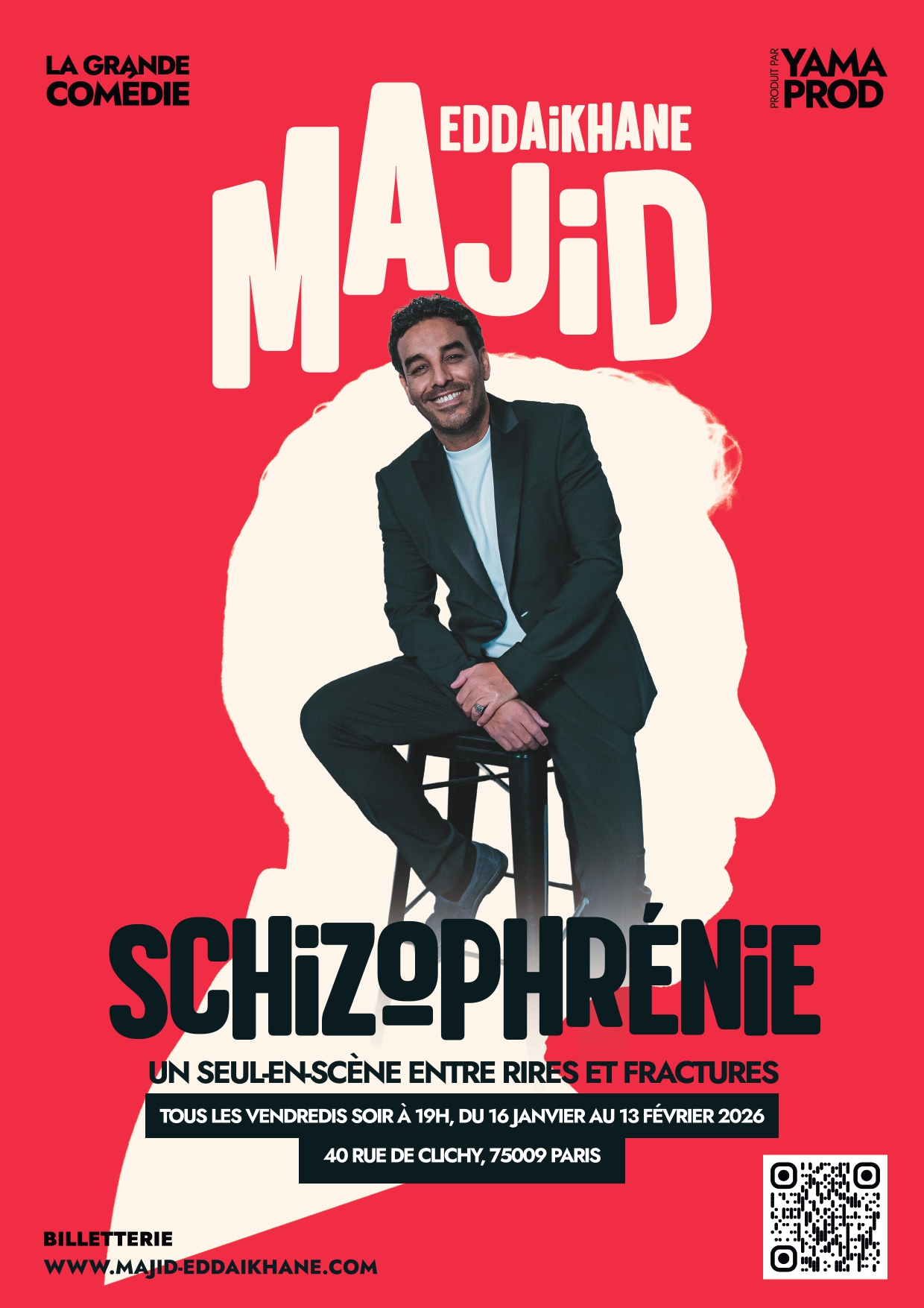 Seul-en-scène hybride et engagé, Schizophrénie retrace le parcours intime de Majid Eddaikhane et explore, par le rire, les questions d’identité, de transmission et de santé mentale. Le spectacle est à découvrir à La Grande Comédie à Paris, tous les vendredis du 16 janvier au 13 février 2026, suivi d’un échange avec le public.