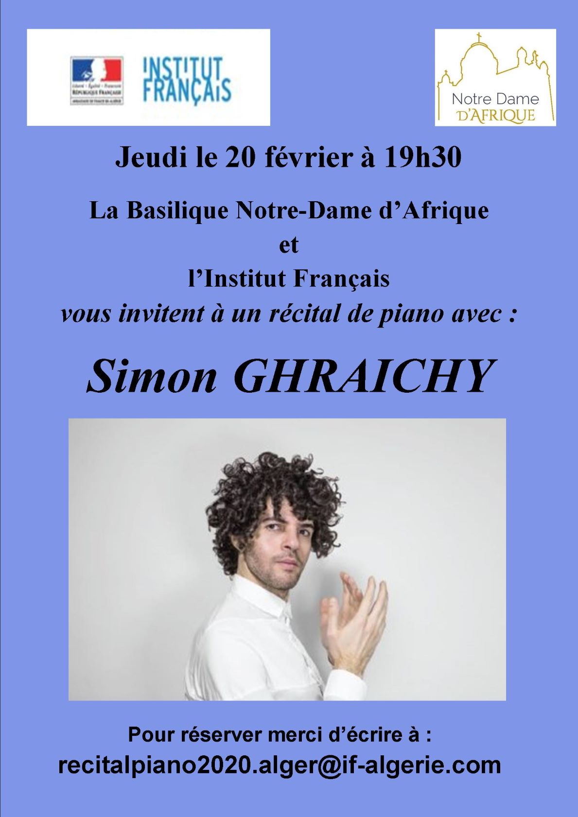A découvrir avec nous, à la Basilique Notre-Dame d’Afrique, l’audace et la virtuosité de Simon Ghraichy, l’un des pianistes français les plus prometteurs de sa génération.Pour toute réservation merci d’écrire à recitalpiano2020.alger@if-algerie.com.