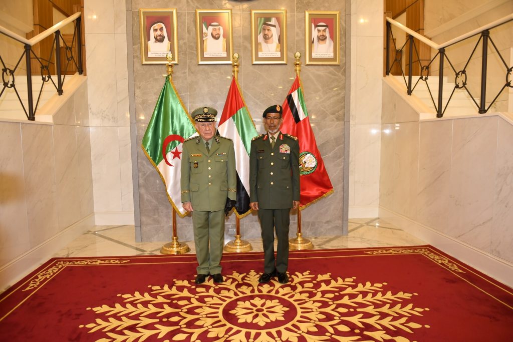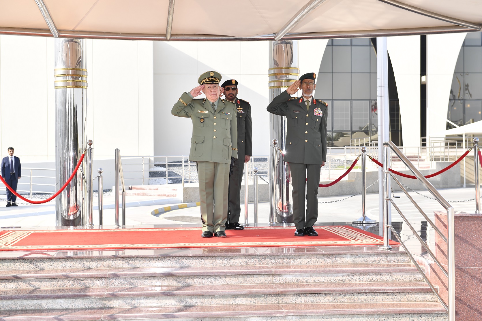 Avant l’ouverture de l’exposition, Monsieur le Général-Major a été reçu officiellement au siège du Commandement de l’Etat-Major Général des Forces Armées Emiraties, par le Général de Corps d’Armée Hamad Mohamed Thani Al-Romaithi, Chef d’Etat-Major des Forces Armées Emiraties, où il a écouté les hymnes nationaux des deux pays et a passé en revue quelques formations des Forces Armées Emiraties qui lui ont rendu un salut d’honneur, pour co-présider, ensuite, aux côtés de son hôte une séance de travail en présence d’un nombre d’Officiers de l’Armée Emiratie et des membres de la délégation algérienne accompagnant Monsieur le Général-Major, pendant laquelle les deux parties ont examiné les domaines de coopération entre les deux Armées et les horizons de sa promotion, au service des intérêts communs des deux pays frères. A cette occasion, le Général-Major a transmis à son homologue émirati les salutations des personnels de l’Armée Nationale Populaire aux personnels des Forces Armées Emiraties