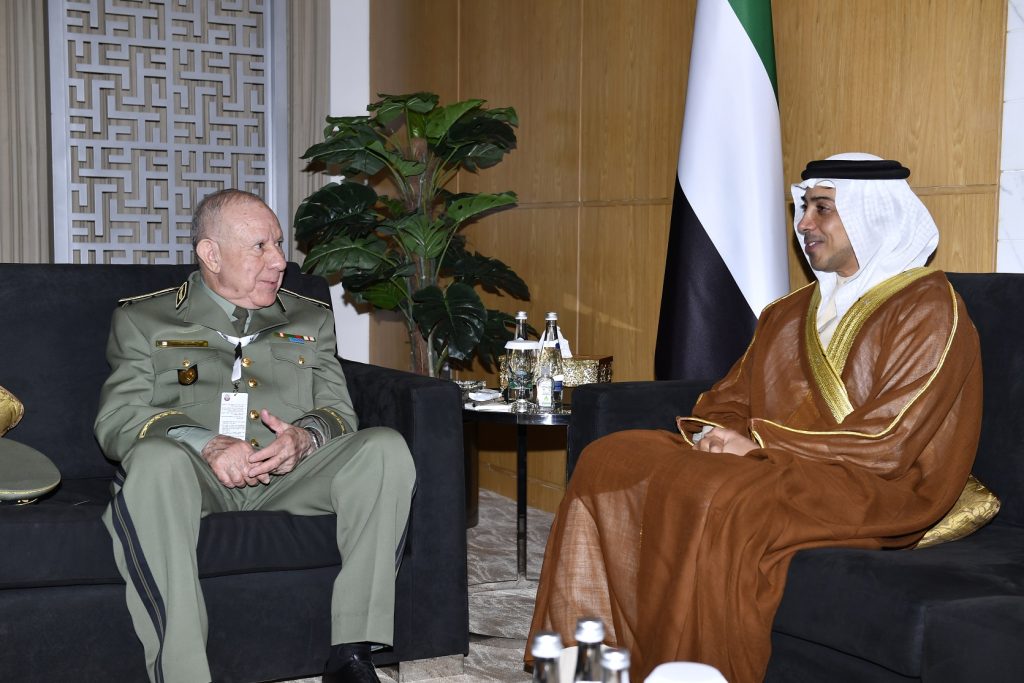 A l’issue et au palais des expositions, le Général-Major était à la tête des Chefs des délégations reçues par le superviseur de cette cérémonie, Son Altesse Cheikh Mansour Ben Zayed Al-Nahyane, Vice-président du Conseil des Ministres, Ministre des Affaires Présidentielles de l’Etat des Emirats Arabes Unis, à qui le Général-Major a transmis les salutations de Abdelmadjid Tebboune, Président de la République Algérienne, Chef Suprême des Forces Armées, Ministre de la Défense Nationale, qui tient énormément à promouvoir la coopération fraternelle entre les deux pays, à la hauteur des aspirations des deux peuples frères. Ensuite, le Général-Major a visité, en compagnie de Son Altesse Cheikh Mansour Ben Zayed Al-Nahyane les différents pavillons de l’exposition Monsieur le Général-Major a eu une rencontre officielle avec Son Altesse Cheikh Mansour Ben Zayed Al-Nahyane, Vice-président du Conseil des Ministres, Ministre des Affaires Présidentielles de l’Etat des Emirats Arabes Unis, en présence, pour la partie algérienne, de l’Ambassadeur algérien à Abou Dhabi, et de l’Attaché de Défense ainsi que des membres de la délégation accompagnant Monsieur le Général-Major, et pour la partie émiratie, du Général-Major Farès Al-Mazrouïe, Ministre d’Etat, Conseiller des Affaires Présidentielles des Emirats Arabes Unis, de Monsieur Souhil Al-Mazrouïe, Ministre de l’Industrie et de l’Energie et de Monsieur Mohamed Ahmed Al-Baouardi, Secrétaire d’Etat des Affaires de Défense. Cette rencontre a permis aux deux parties de passer en revue l’état de la coopération entre les armées des deux pays, notamment dans le domaine des fabrications militaires qui a connu un développement remarquable, et qui constitue un modèle de réussite pour la coopération entre les deux pays frères. Selon le communiqué du Ministère de la Défense Algérienne.