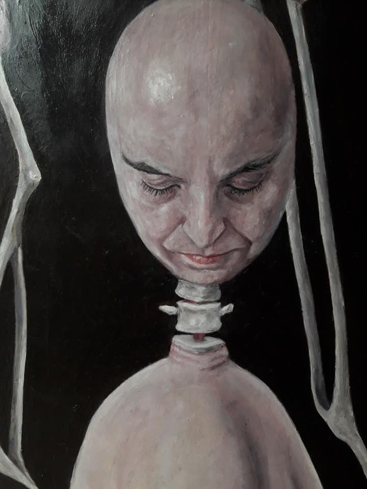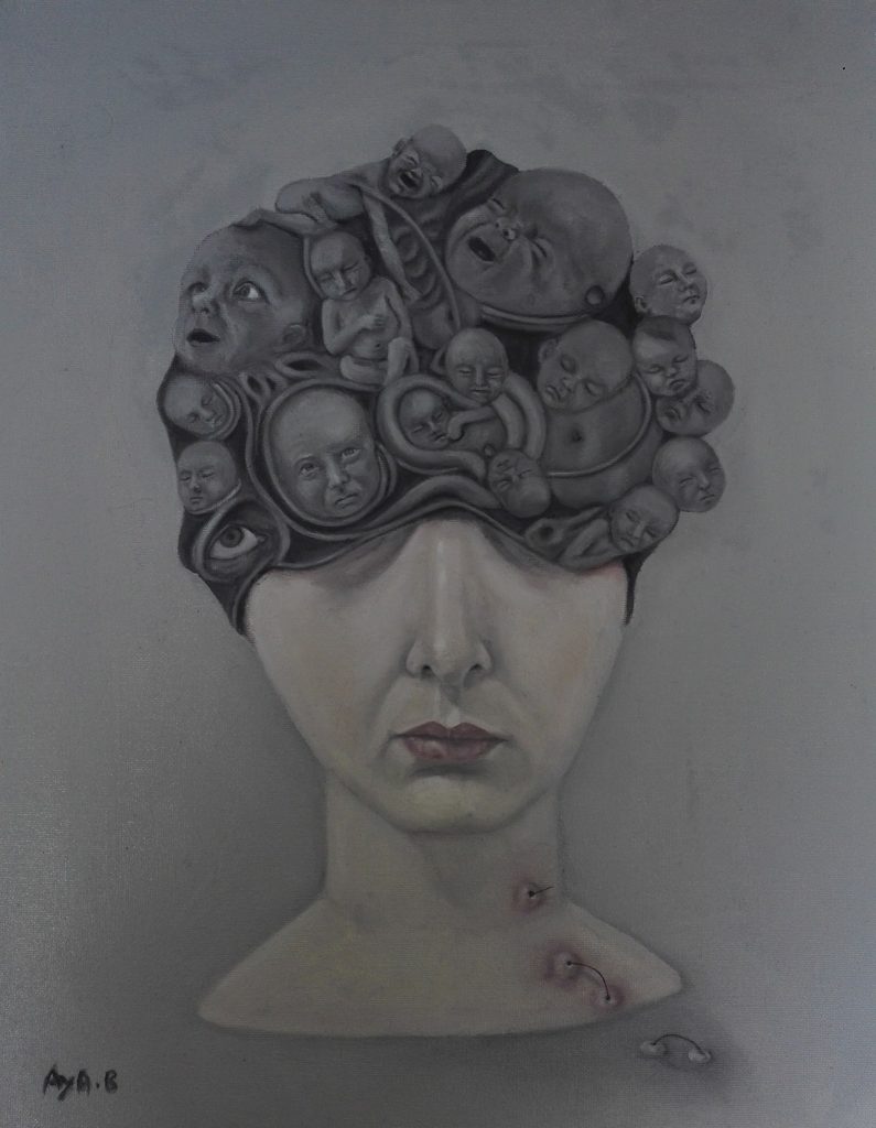 L’artiste présente une vingtaine d’œuvres chaotiques, traduisant toute une philosophie de la vie, sa philosophie de la vie.Les œuvres en question se targuent de générer une sensation d’étrangeté mais porteuses d’un sens certain. L’illusion est parfaite et l’effet garanti. Après un instant de frustration, le regard commence à apprivoiser et à percer le mystère de ces âmes tourmentées. Ici on découvre un corps disloqué. Là, on aperçoit des vertèbres interalliées, soutenant une colonne vertébrale. Un peu plus, on observe une tête de femme aux lèvres tracés d’un rouge à lèvres et au cerveau, truffé d’une multitude de sacs embryonnaires. Ces derniers comportent des visages de différentes formes, reliés tous par un cordon ombilical. A la question de savoir comment notre jeune artiste peintre définit sa peinture, elle estime que « sa peinture découle de sentiments figés et coincés sur une toile ».