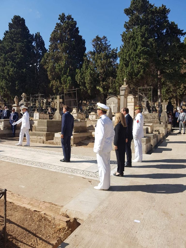Emmanuel Macron s’était rendu au cimetière européen de Bologhine (ex-Saint-Eugène) à Alger, accompagné par les membres du gouvernement et la délégation, il a rendu hommage aux victimes françaises de la guerre. Sous un soleil de plomb, il a d’abord déposé une gerbe devant le monument aux « Morts pour la France » M. Macron était accompagné du ministre de la Défense, M. Sébastien Lecornu, et des représentants d’associations d’anciens combattants.