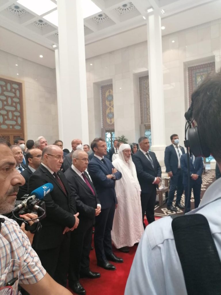 Durant sa visite, M. Macron et sa délégation étaient accompagnés par le ministre des Affaires étrangères et de la Communauté nationale à l’étranger, Ramtane Lamamra, le ministre de l’Habitat, de l’urbanisme et de la ville, Mohamed Tarek Belaribi, le ministre des Affaires religieuses et des Wakfs, Youcef Belmehdi, et le recteur de Djamaâ El-Djazair avec rang de ministre, Cheikh Mohamed Maâmoun Al Kacimi Al Hoceini. Le Président français a contemplé cet édifice religieux, culturel et scientifique, , la plus grande d’Afrique et la troisième plus grande au monde, après la mosquée Al-Haram à la Mecque et la mosquée Al-Nabawi à Médine. Ensuite emmauel. Macron s’était rendu au cimetière européen de Bologhine (ex-Saint-Eugène) à Alger.