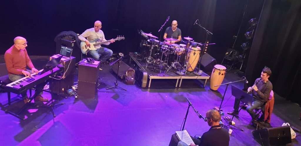 2- En répétition, de gauche à droite : Mustapha Mataoui : Piano et direction musicale, Kamal Mazouni : Basse, Amar Chaoui : Percussions, Hugo Proy : Clarinette, Mehdi Askeur : chant/accordéon – Le Nouveau Cap à Aulnay sous Bois, le 29/11/2019 – © Formation Wahrani